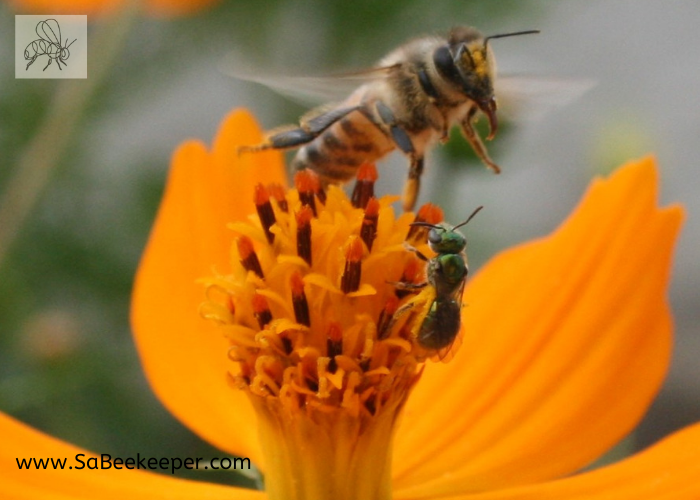 The picture show you the size of the honey bee and the tiny sweat bee, both on a flower together.